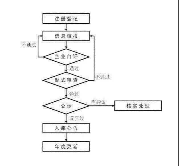 科技型中小企业评价工作实行网络化管理,评价工作在“全国科技型中小企业评价工作系统”( 以下简称“评价工作系统”,网址www.innofund.gov.cn)中进行。企业对照《科技型中小企业评价办法》自主评价是否符合科技型中小企业条件,认为符合条件的,自愿在服务平台上注册登记企业基本信息,在线填报《科技型中小企业信息表》,信息完整且符合条件的,由省科技厅在服务平台公示10个工作日。公示无异议的纳入信息库并在服务平台公告,赋予“科技型中小企业入库登记编号”。